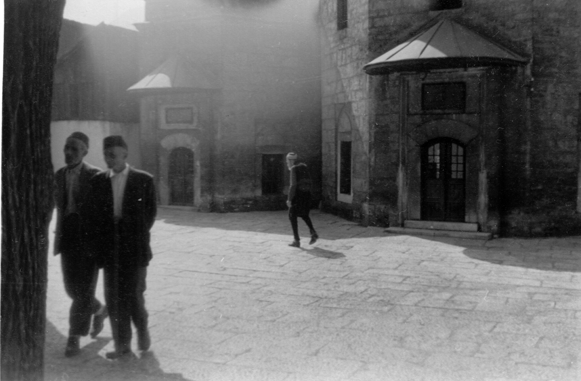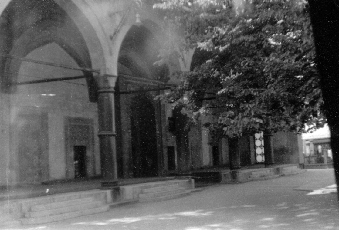 Nachdem wir so den alten Teil von Sarajewo durchstöbert hatten, haben wir die Beg-Moschee (Abb. re. oben und unten) besichtigt. Es ist ein Kuppelbau von ca. 50m Höhe. Das ganze Innere ist mit Teppichen ausgelegt und es findet sich kein Gestühl. Gegenüber dem Eingang liegt der Altar, der völlig ohne Schmuck in einer Apsis steht. Gepredigt wird von einer 1m hohen Plattform, die direkt an eine Tür angebaut ist. Die Männer knien davor während der Predigt, die Frauen müssen dagegen hinter einer Barriere an der Wand sitzen. Die Beg-Moschee ist eine der größten Moscheen in Jugoslawien und ist im 16. Jahrh. im türkischen Stil erbaut worden.