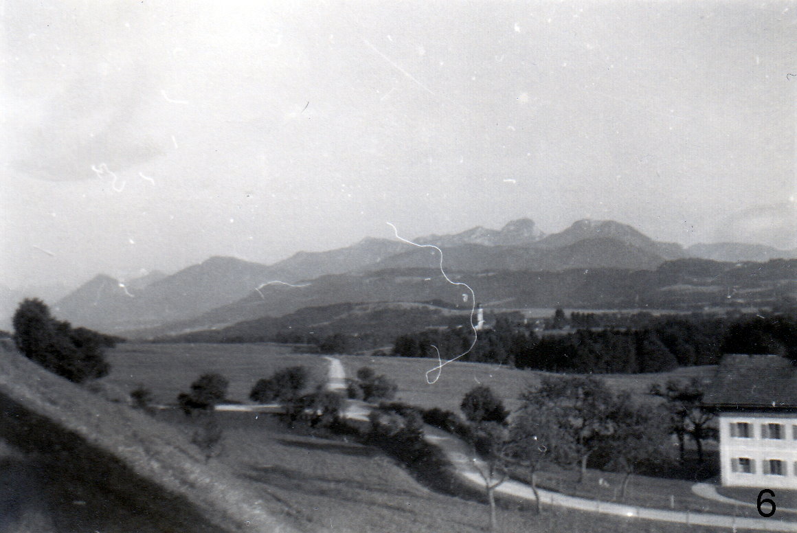 Die Fahrt war herrlich mit dem Blick auf die fernen Berge (Abb.). Allmählich rückten sie näher, und schließlich bog die Autobahn scharf nach Osten, und wir fuhren an dem Mangfall-Gebirge entlang. Der scharfe Übergang vom Flachland zu den hohen Bergen war eigenartig und schön. Hoch an den Hängen sahen die Dörfer wie Spielzeug aus. wir üb erquerten die Mangfall, die als kleines, reißendes Flüßchen unter der Autobahn hindurchfloß. Auf der rechten Seite folgte dann bald zu den Bergen hin der kleine,aber sehr romantische Seehamer-See. Der Inn, den wir wenig später überquerten, bot hier schon einen gewaltigen Anblick. Unbeschreiblich schön war dann schließlich der Chiemsee, der plötzlich, nachdem wir auf eine Anhöhe gefahren waren, weit vor uns hingebreitet lag. Besonders friedlich und ruhig lag er in der goldenen Abendsonne. Bis zur Autobahnabfahrt Bad Reichenhall fuhren wir dann weiter und verließen dort die Autobahn.