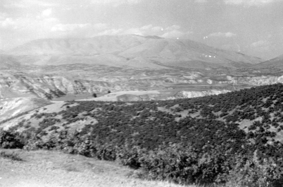 Die Landschaft hat hier überall den gleichen Charakter: Braun ist die vorherrschende Farbe, ob sie von trockenen Wiesen oder von kahlem Boden stammt. Felsen sieht man seltener. Die kleineren Berge sind stumpf adgerundet, auch die hohen sind nicht so bizarr wie in den Alpen bei uns. Die Südhänge zeigen fast gar keinen Baumwuchs, während die Nordhänge etwas mehr bestanden sind. In den Tälern und wo es sonst die Feuchtigkeit zulässt, wird Ackerbau getrieben.