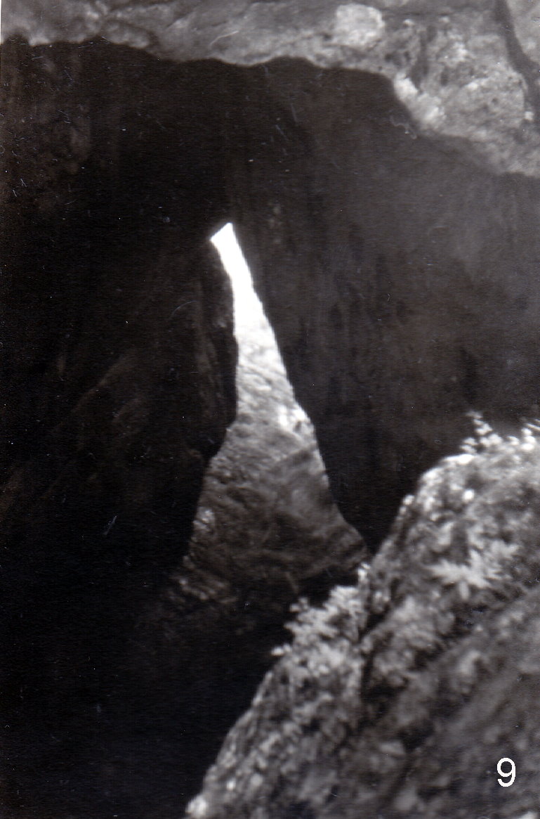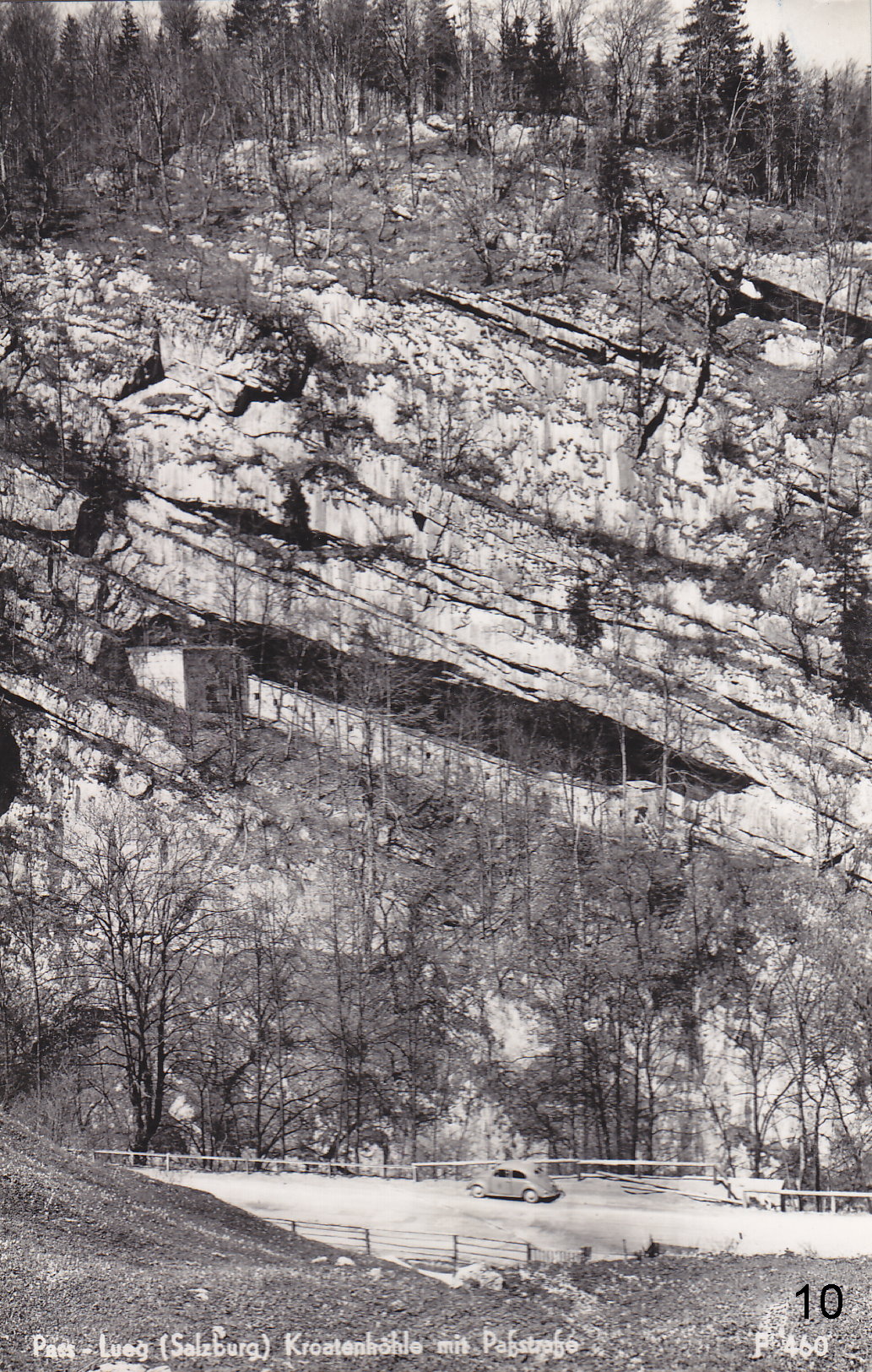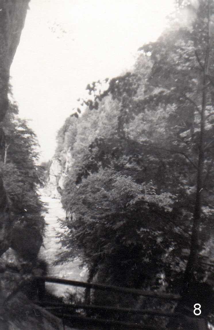 Die Straße führte uns durch das herrliche Salzachtal. Der Fluß hat wie alle Flüsse hier eine eigenartig grünweiBe Farbe. Nach starker Steigung kamen wir auf den Paß Lueg. Von dort haben wir zu Fuß die unbeschreiblich schöne Salzachklamm angesehen (Abb 8 und 9). Diese Naturgewalt ist sehr eindrucksvoll. Auch die in der Nähe gelegene Kroatenhöhle (Abb 10) haben wir noch besucht. Es ist eine Festung, die von den Österreichern 1809 während der Befreiungskriege gebaut worden war, um die gegenüberliegende Straße für den Rückzug der napoleonischen Truppen abzusperren. Entlang der sehr reißenden Salzach ging es zwischen Hagen-Gebirge und Tennen-Gebirge bis kurz hinter Werfen, wo eine schöne Burg im Tal auf einem Hügel liegt (Abb. 11). Dort sind wir nach Osten in ein Seitental der Salzach abgebogen.