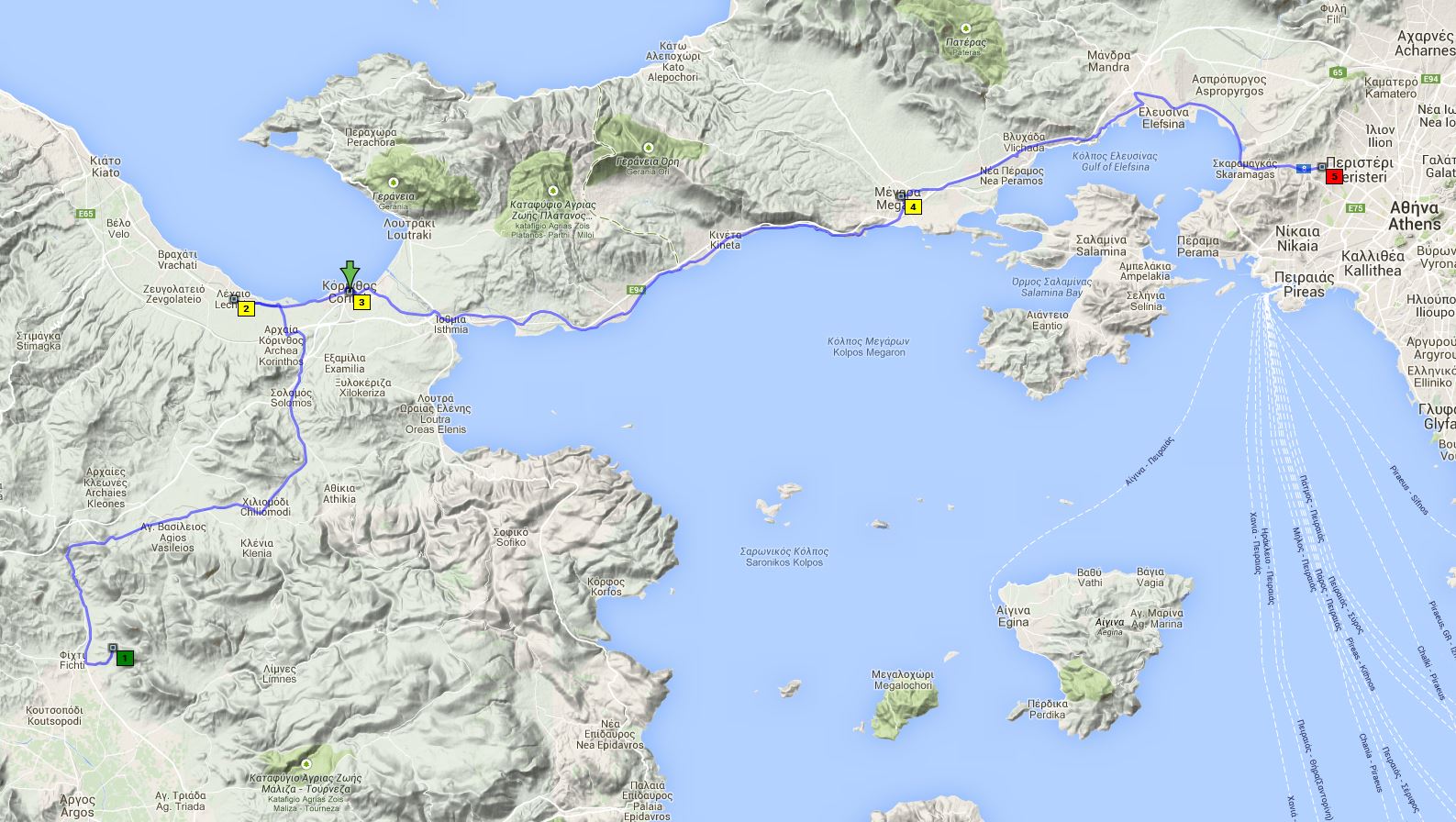 Vom Isthmus fuhren wir dann auf der nördlichen Hälfte wieder an das Meer hinunter und durch die Küstenniederung weiter, oft direkt am Wasser. Über Megara kamen wir in die Gegend von Salamis, wo uns die Straße an den Bergen, die hier steil ins Meer abfallen, in wechselnder Höhe entlangführte. An der Insel Salamis ging es dann vorbei, um die Bucht von Eleusis herum und schließlich über eine Anhöhe hinweg in die Ebene von Athen. Von dieser Anhöhe, dem Aigaleos, aus lag das Häusermeer vor uns und inmitten der Häuser die Akropolis.
