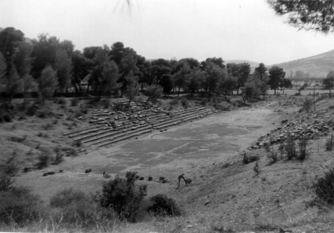 Außerhalb des Heiligtums, südlich vom heiligen Bezirk, liegt das noch gut erhaltene Stadion. Es ist 181,30 m lang und an drei Seiten von Wällen für die Zuschauer umgeben, die sich zur offenen Westseite hin neigen. Etwa in der Mitte befinden sich noch Sitzstufen für die Ehrengäste und Kampfrichter. Start und Ziel sind an Quersteinen noch gut zu erkennen.