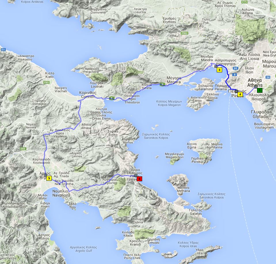 Hinter Korinth haben wir etwas Pause gemacht und uns an Weintrauben satt gegessen. Ich habe in der Zeit meine Lenkungslager festgestellt. In schneller Fahrt ging es dann weiter bis Nauplia (heute: Navplion) und von dort aus wieder landeinwärts. In vielen Windungen ohne große Höhenunterschiede führte uns die Straße durch stark hügeliges und bergiges Land nach Epidauros.