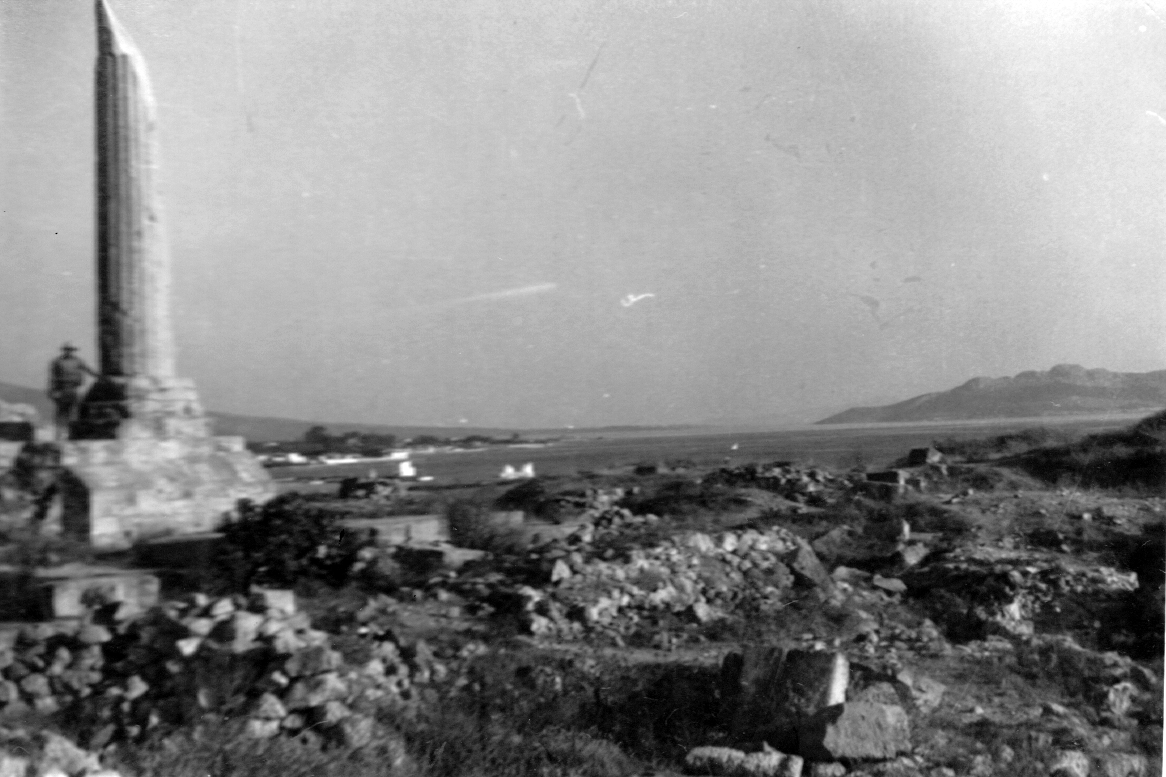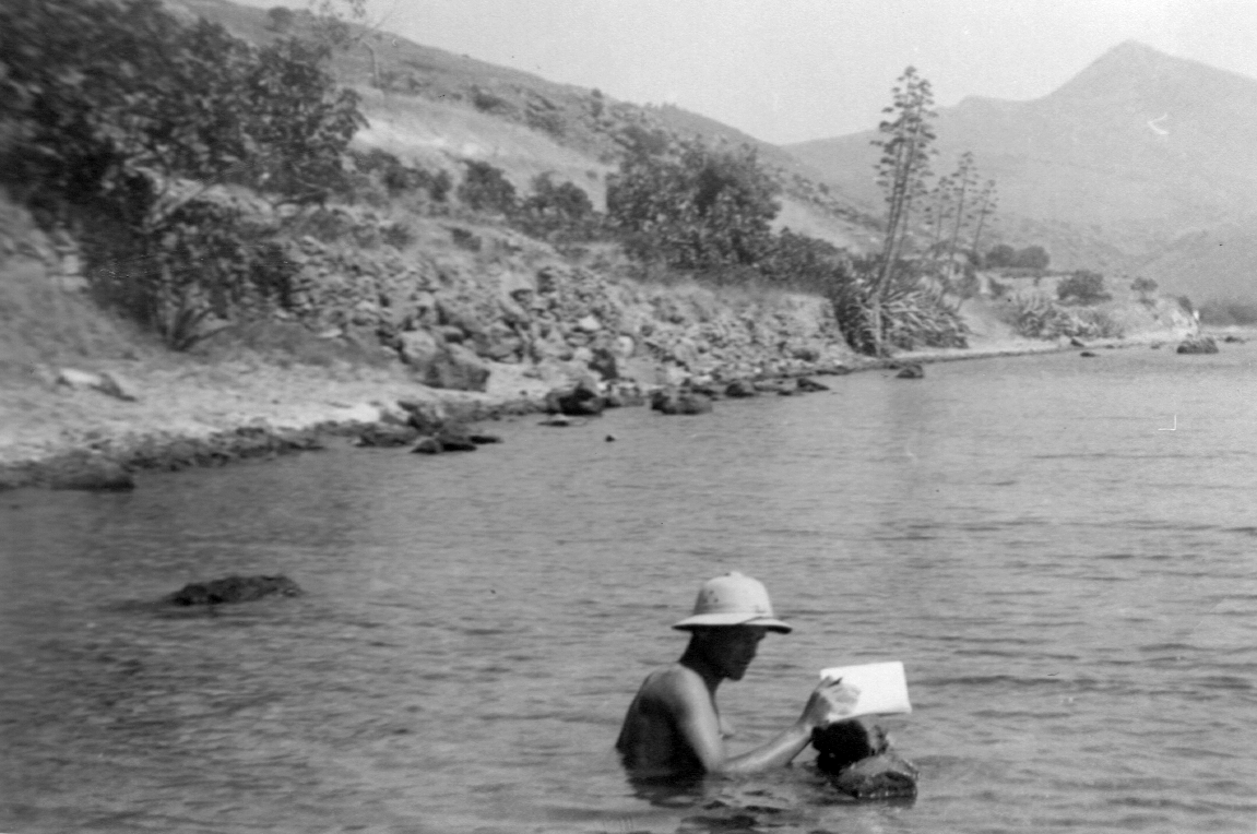 Nachdem wir in den ruhigen Hafen von Aigina eingelaufen waren, haben wir das Schiff verlassen. Am Ufer standen in Erwartung der Besucher eine Menge Kutschen. Hier gilt also das Pferd noch etwas, wie wir als Tierärzte gleich feststellen mussten. Von hier aus sind wir an der Küste in brütender Hitze entlanggegangen, bis uns der Durst in ein Dorf trieb, wo wir in einem Haus um Wasser baten. Man gab uns sehr freundlich Gläser und einen Krug mit Wasser und dazu zwei Tellerchen mit etwas Kompott, wie es in Griechenland üblich ist. Überall hat man anscheinend die Deutschen gern.
