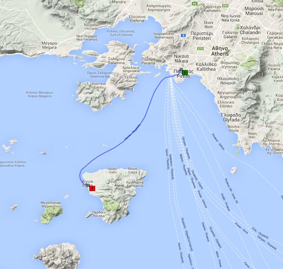 7.00 Uhr waren wir in Piräus, wo wir uns zur Anlegestelle begaben. Dort haben wir die Karten gekauft (Hin- und Rückfahrt = 56 Drachmen) und haben das Schiff bestiegen. In der halben Stunde Wartezeit konnten wir schön das Treiben am Hafen beobachten. Um 8 Uhr fuhr das M.S. "Aigina" ab. Wir hatten einen ganz guten Platz auf dem Vorschiff, allerdings in der Sonne, aber wir hatten ja unsere Tropenhelme mit.