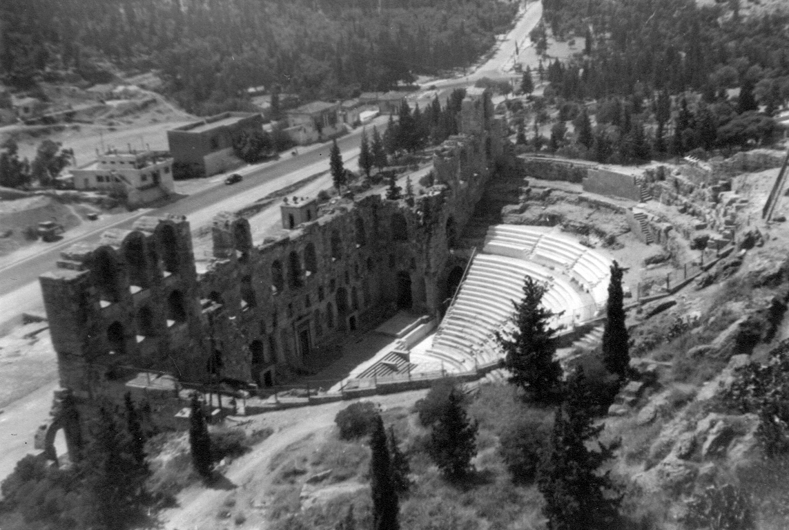 Anschließend fuhren wir zur Akropolis, wo wir uns am Fuße des Hügels das Herodes-Attikus-Theater angesehen haben (ca. 5000 Sitzplätze.). Herodes-Attikus, ein reicher Grieche in römischen Diensten, hat es gestiftet, wie noch verschiedene andere Bauten, z. B. in Korinth die Verbindung des Odeions mit dem Theater durch ein Foyer. Das Theater des Herodes-Attikus ist wieder renoviert und wird heute noch zur Aufführung klassischer Dramen benutzt. Wir hatten das Glück, dass heute abend "Oedipus Rex" gespielt wurde,und haben uns gleich Karten besorgt.