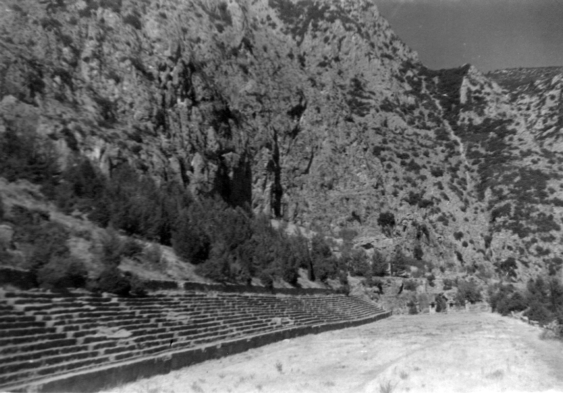 Außerhalb des heiligen Bezirkes liegt etwa 50m höher, an einer Stelle, an der man keine größere waagerechte Fläche mehr vermutet, unmittelbar an der steil aufsteigenden Felswand das Stadion (Abb. re. unten), das noch recht gut erhalten ist. Es ist allerdings erst in römischer Zeit auf einer älteren Anlage ausgebaut worden.