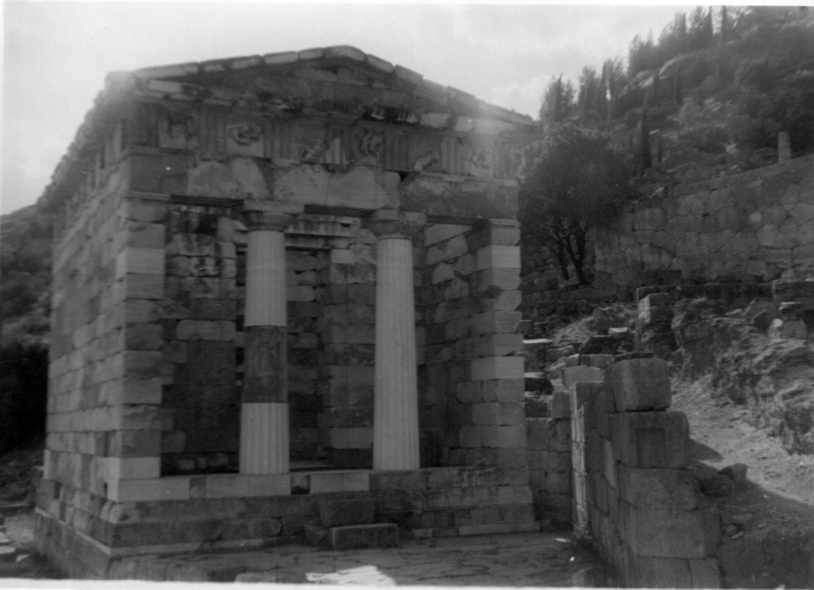 Die Orakelsprüche der Pythia gingen in die ganze damalige Welt und da sie so geschickt abgefasst waren, dass sie sich wohl immer erfüllten, behielten sie auch über die vielen Jahrhunderte ihre Bedeutung.und Ansehen. Als Dank für die Weissagungen stellten die einzelnen Poleis (Staaten) hier Schatzhäuser mit Weihgaben auf. So sind heute noch eine Menge im heiligen Bezirk am Wege zum Apollo-Tempel zu erkennen. Besonders gut erhalten oder besser Anfang des 19. Jahrh. renoviert ist das Schatzhaus der Athener. Es steht hinter der ersten Wegkrümmung unterhalb des Apollotempels.Direkt an der Stützmauer des Tempels stand noch eine Halle der Athener mit zierlichen Säulen, um die Weihgeschenke nicht zu sehr zu verdecken.