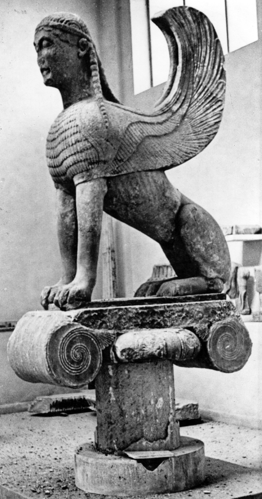 Der Sieger baute gern sein Schatzhaus mit den Siegestrophäen gegenüber dem des Besiegten auf, so z.B. Syrakus gegenüber dem Athener Schatzhaus. Westlich der Halle der Athener, zwischen dieser und dem Schatzhaus‚ stand die Sphinx der Naxier (Abb. li.). Der Apollo-Tempel steht auf einer Terrasse (Abb. re. oben), die nach Süden durch eine Mauer abgestützt ist (Abb. re. oben). Die Steine sind kurvenpolygonal und geben so ein kunstvoll gefügtes Bild. Der alte Bau aus dem 6. Jahrh. ist durch ein Erdbeben zerstört worden und im 4. Jahrh. mit Hilfe von Spenden aus ganz Griechenland wieder aufgebaut worden. In christlicher Zeit ist der jüngere Bau aber so stark zerstört worden, dass man sich jetzt von dem älteren an Hand der ausgegrabenen Bauglieder ein besseres Bild machen kann.