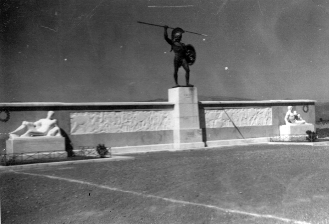 Dort fanden wir dann auch bald das links der Straße gelegene moderne, von König Paul gestiftete Denkmal, das einen griechischen Krieger in natürlicher Größe und darunter zu beiden Seiten einen Fries mit dem Kampf an den Thermopylen darstellt. Rechter Hand liegt neben der Straße der Leonidas-Hügel, unter dem der König begraben wurde. Hier ist der Rest der Spartaner über ihrem gefallenen Führer zusammengehauen worden. Auf dem Leonidas-Hügel liegt eine Tafel aus neuer Zeit mit einer Inschrift des Simonides.