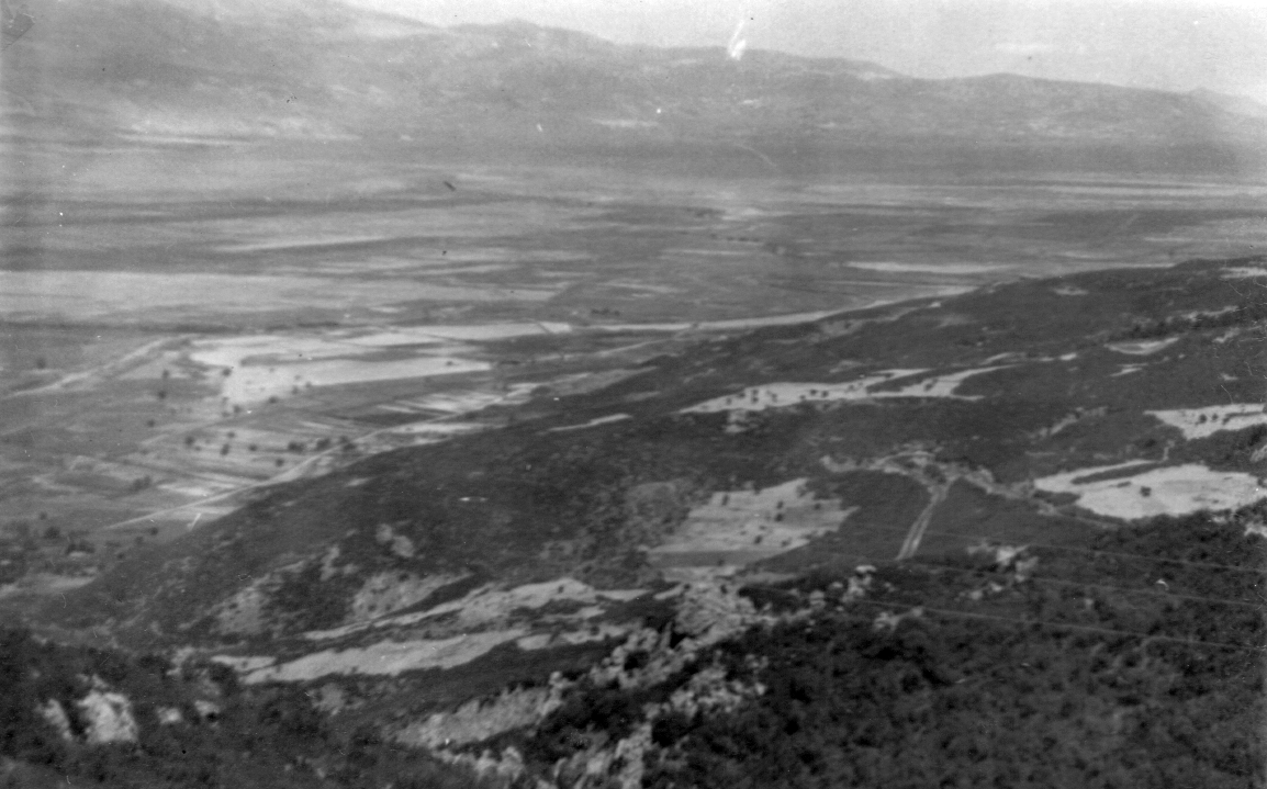 Lamia liegt am Hang der Berge an der Nordseite der Ebene. Steil ging es wieder hinauf in die Berge auf ca. 800 m Höhe. Von hier aus konnten wir die ganze Ebene von Lamia bis zu den gegenüberliegenden Bergen und dem Meer überblicken. Die Berge an der Nordseite fallen von teils 2000 m schroff ab, die Nordseite erhebt sich dagegen langsam. Dann fuhren wir hinunter in eine Hochebene, in der ein See liegen sollte, den wir aber nicht sehen konnten. Am Rande der Hochebene stieg die Straße wieder in Windungen an, und wir hatten schließlich einen herrlichen Blick auf die sich tief unter uns ausbreitende Ebene, in der Pharsala liegt.