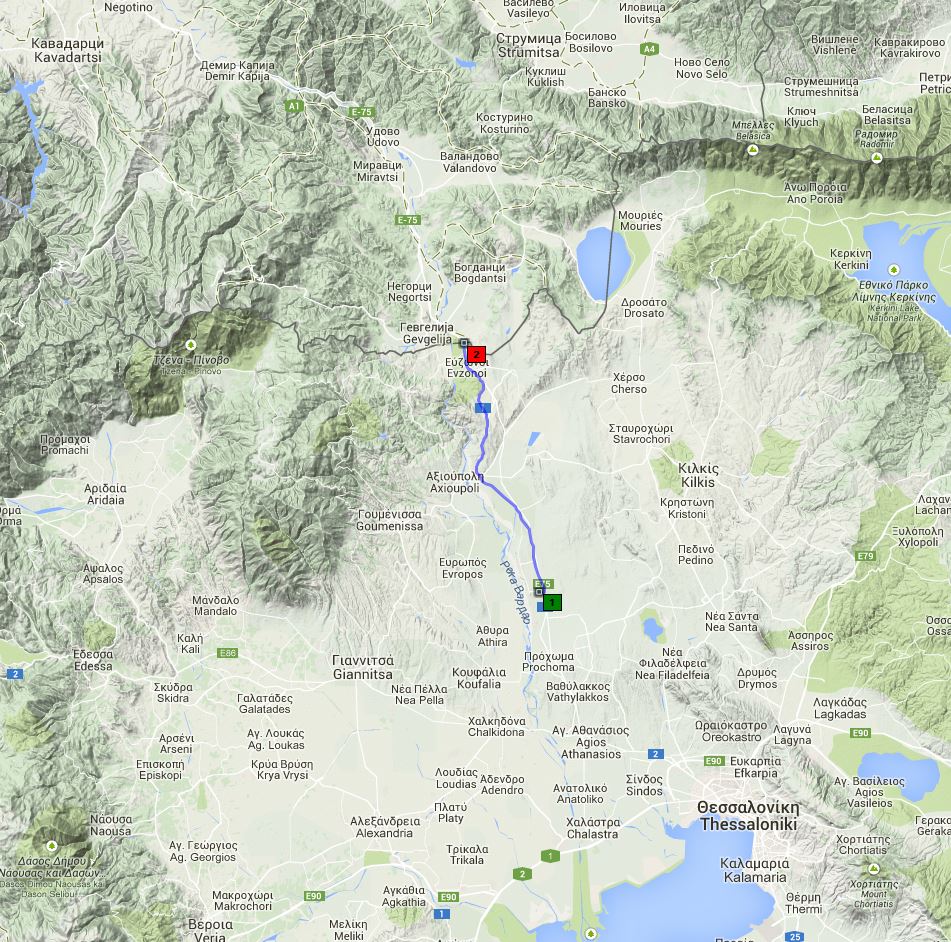 Etwa 11 Uhr fuhren wir ab. Die Wäsche war inzwischen in der Sonne trocken geworden, so dass ich sie wieder anziehen konnte. Von Vathilakon aus ging es über einige Hügel hinweg bis nach Aspropotamia und dann in der Flussniederung des Axios weiter bis Polykastron. Hier habe ich noch eine halbe Gallone Benzin geta kt und einen Liter Öl für den Ölwechsel gekauft, den ich hier gleich gemacht habe. Für das restliche Geld habe ich Zigaretten und Eis gekauft.