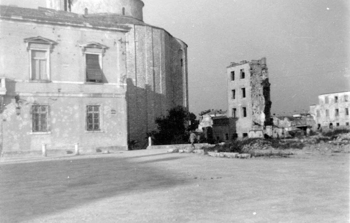 17 Uhr fuhren wir dann nach Zadar, um die Stadt kurz zu besichtigen und zu tanken. Man findet hier direkt am Meer den ältesten Teil der Stadt. Dort steht eine Kirche aus dem 9. Jahrhundert (Abb. re.), von der allerdings nur noch Säulen und Türbögen in der alten Form zu sehen waren, während das andere bei einer Renovierung überdeckt worden ist. Reste von Säulen und andere große Steine sind unregelmäßig als Fundament genutzt worden. Ob die Kirche einmal zerstört wurde und dann die Trümmer beim Aufbau wieder mit verwendet wurden? Ich weiß es nicht. In der Umgebung finden sich noch viele Reste. Die Kirche besitzt Rundform und steht mitten in einem Trümmerfeld aus dem letzten Weltkrieg. Da hier in Zadar deutsches Militär stationiert war, hatten die Amerikaner die Stadt bombardiert und dabei viel zerstört.